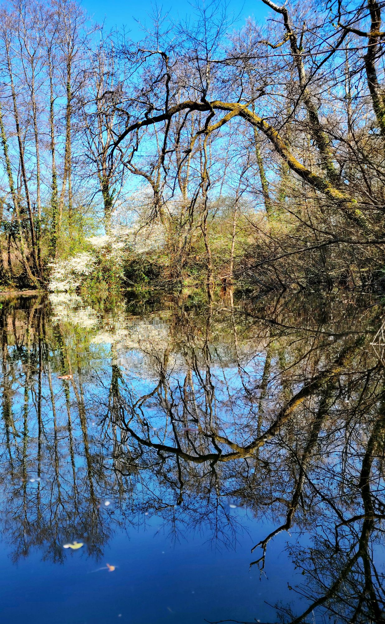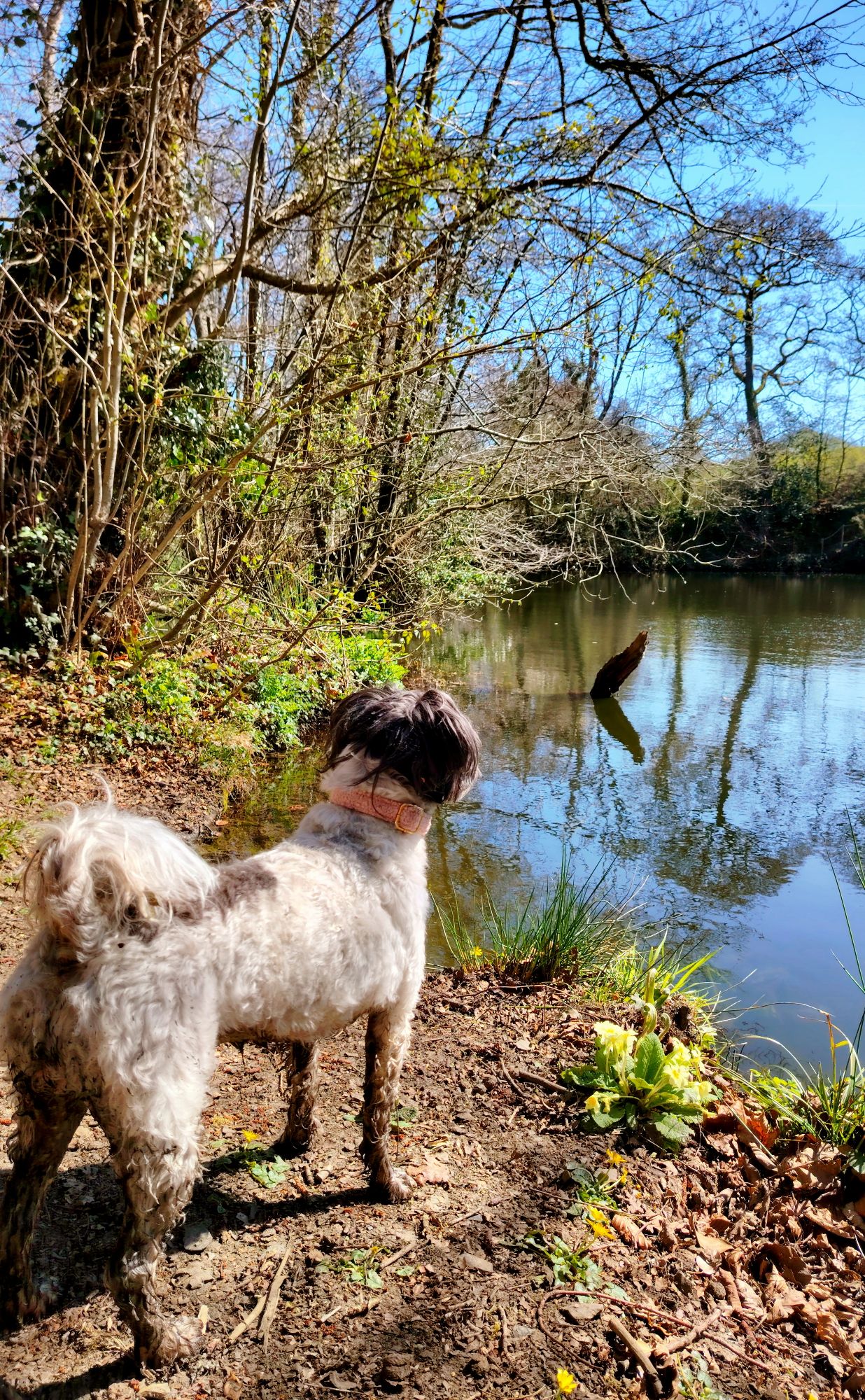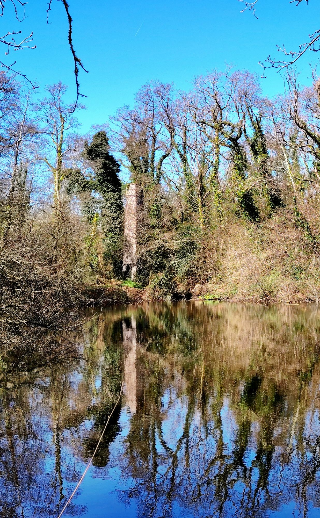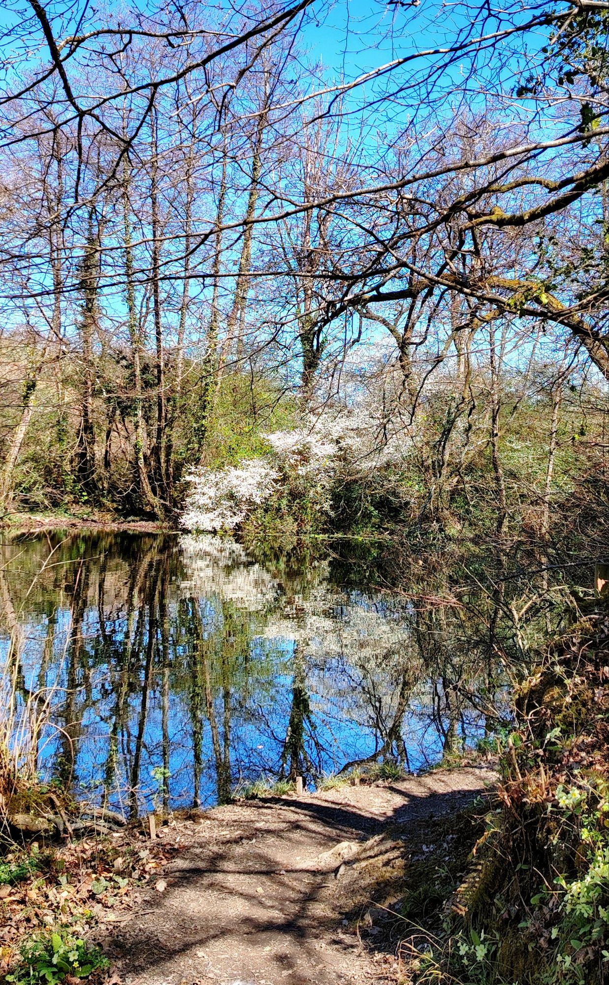 Today we took Daisy the dog for a walk along the riverbanks of Venn Quarry Woods in North Devon. We discovered a network of footpaths, meandering through carpets of wild garlic and primroses in the glorious sunshine, the ruins of a lime kiln and a lake which produced fabulous reflections of the surrounding trees.
