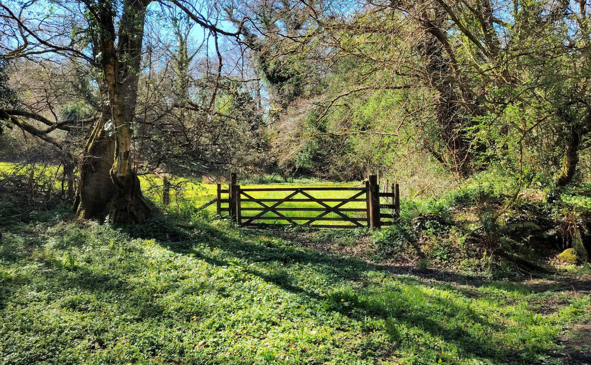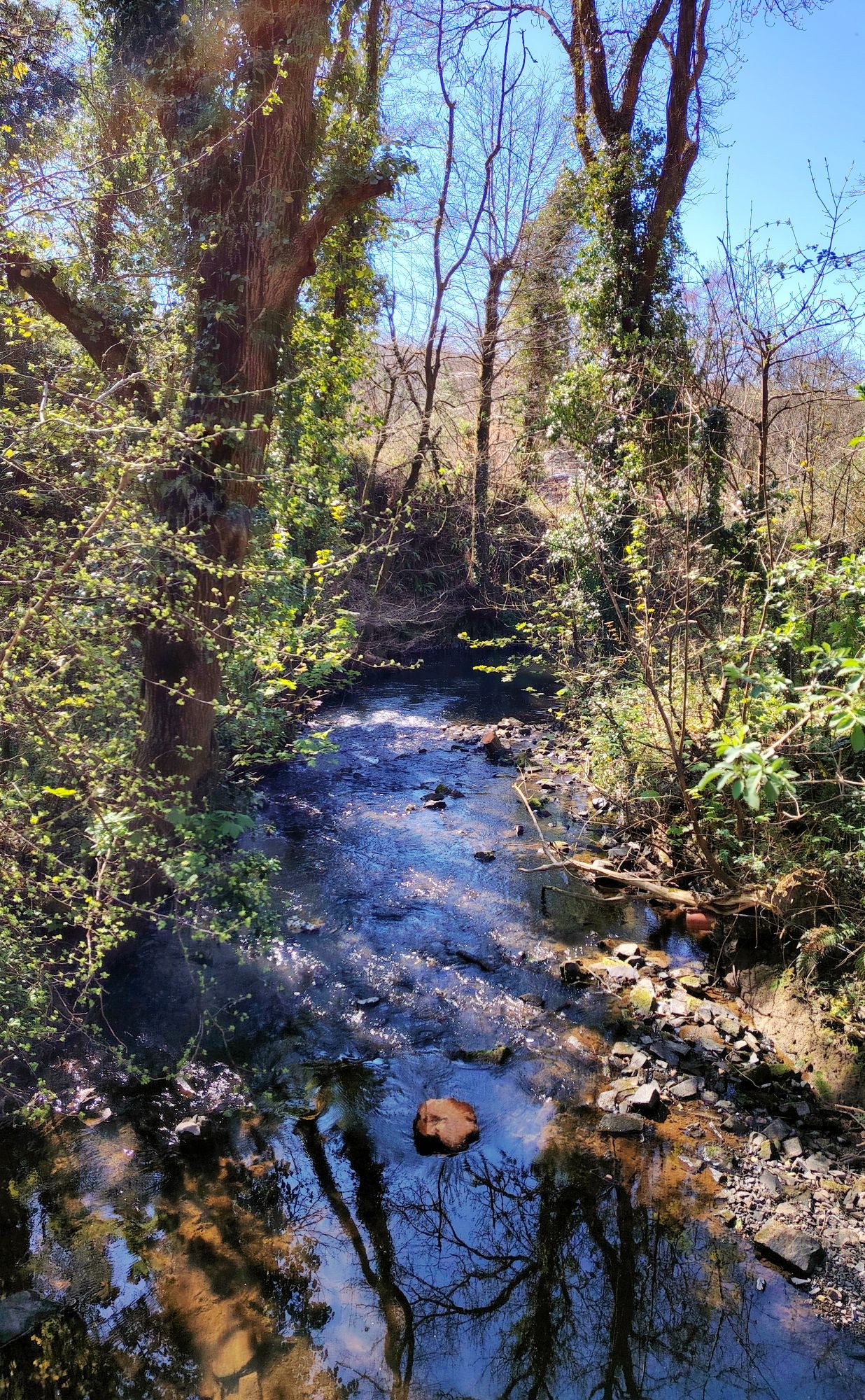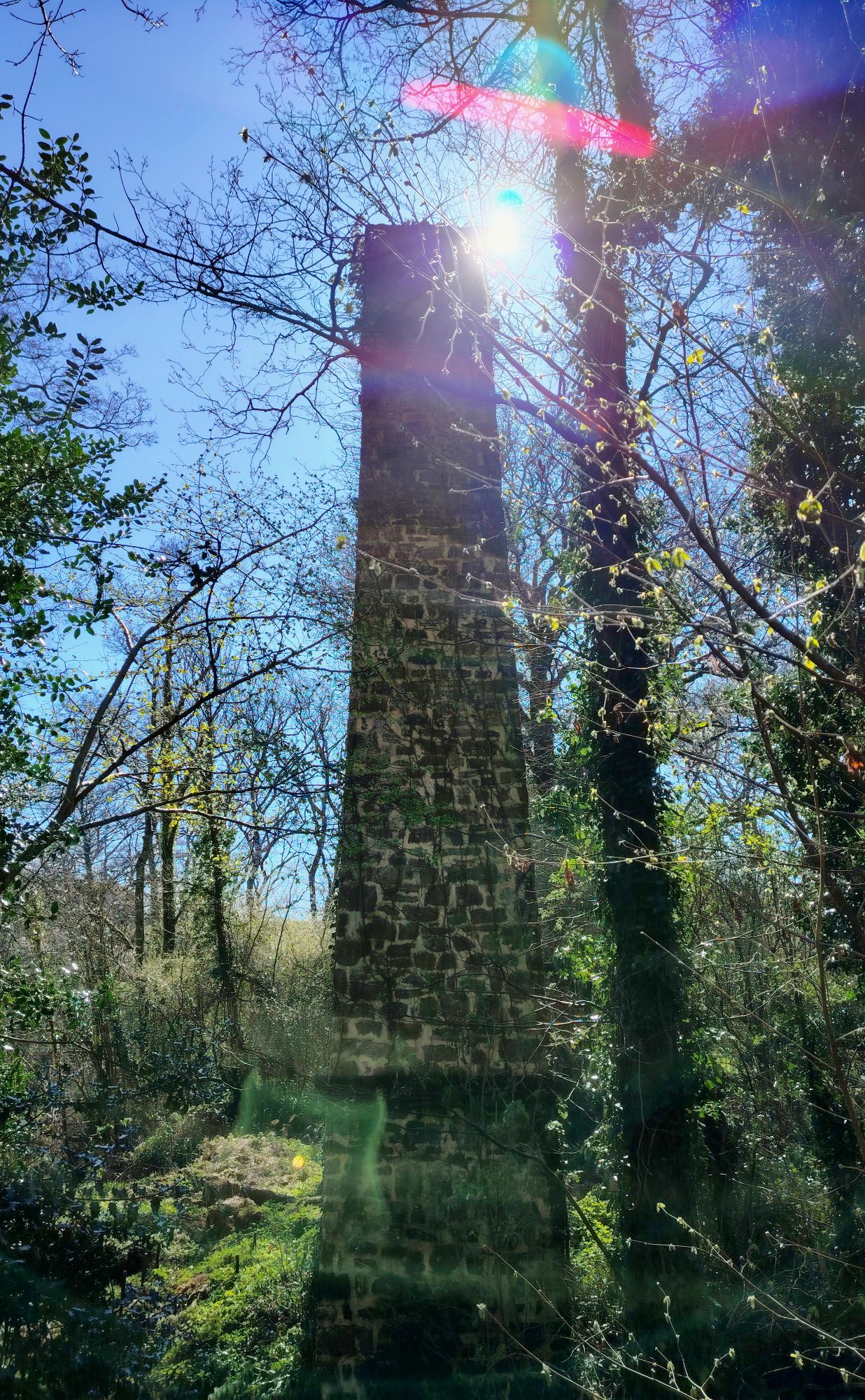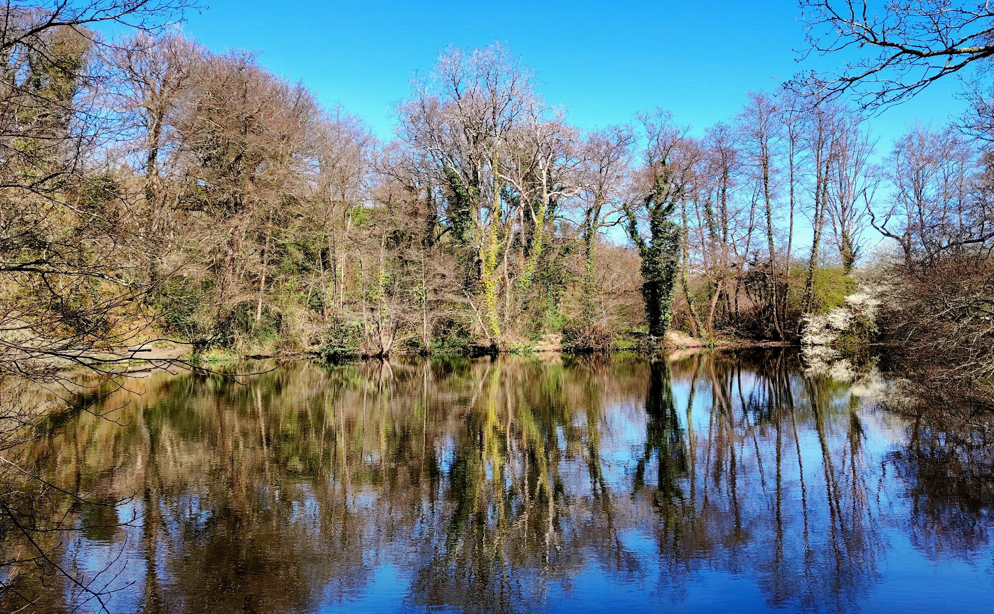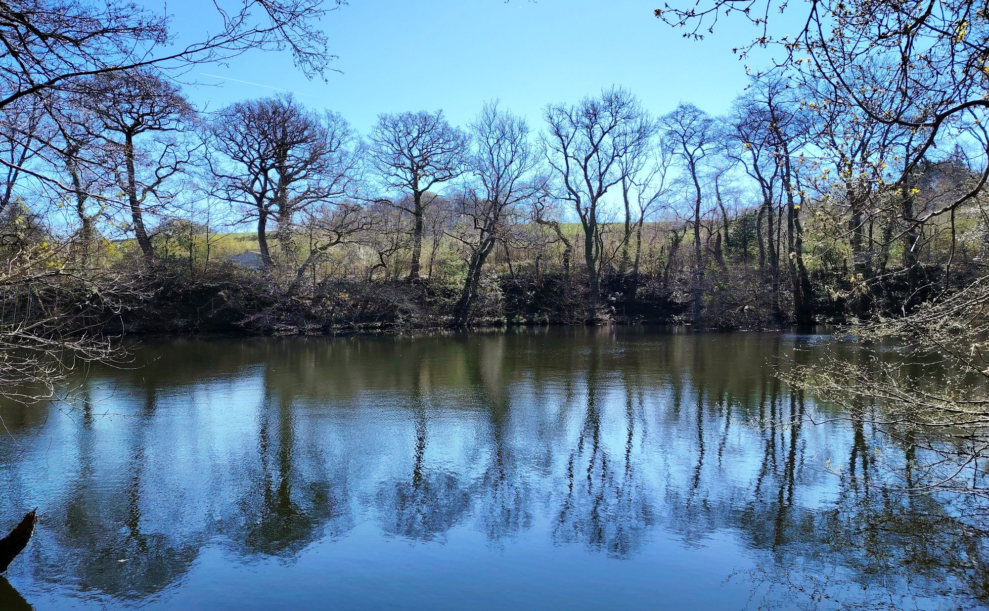 Today we took Daisy the dog for a walk along the riverbanks of Venn Quarry Woods in North Devon. We discovered a network of footpaths, meandering through carpets of wild garlic and primroses in the glorious sunshine, the ruins of a lime kiln and a lake which produced fabulous reflections of the surrounding trees.